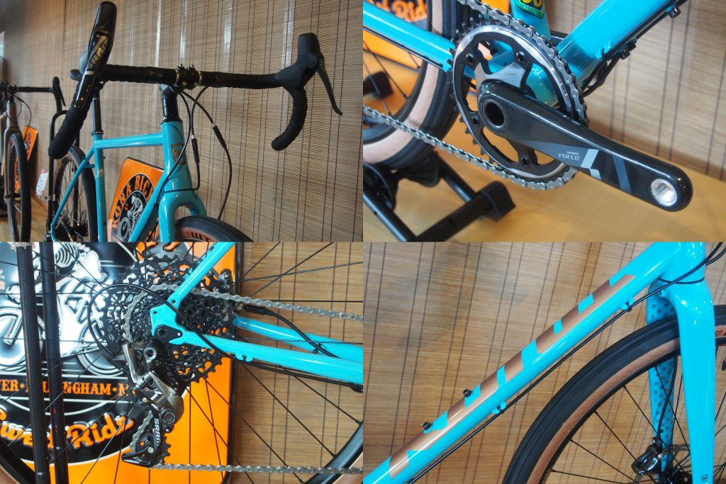 溶接も美しいアルミフレームに新型カーボンフォークは前後ともに12mmスルーアクスル規格。 コンポーネントはSHIMANO105油圧ディスクブレーキ仕様で使用頻度の高いリアディレーラーのみULTEGRAを採用。フロントディレーラーはよりタッチの軽いリニューアルされた新型105。