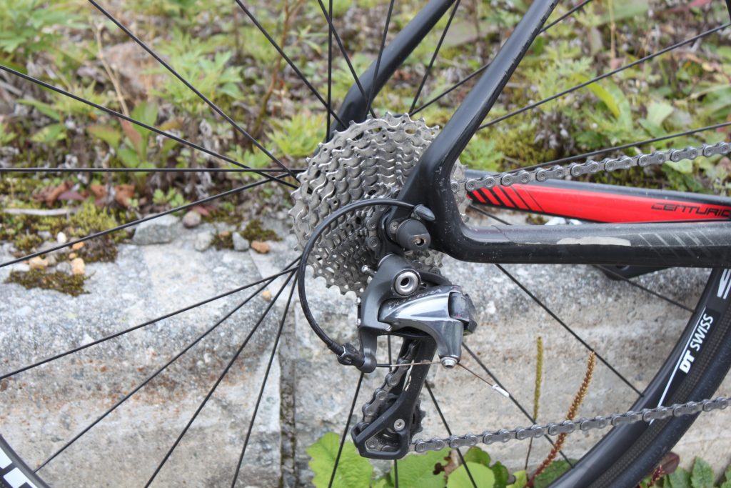 CENTURIONの特徴的な部分なのですが、ロードバイクにも全モデルにミドルゲージのリアディレーラーを採用し、ワイドなギア比設定にすることでとても軽いギアを実現。初心者の方でも上り坂でギブアップすることなくペダリングしていけます。