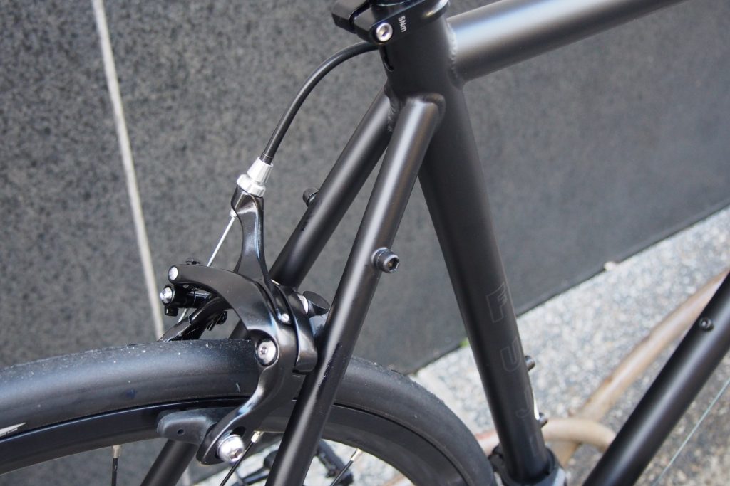 ブレーキキャリパーはノンブランドのWピポット型が採用。より安全性=制動力を高めるなら、ここはSHIMANO製へのカスタムがオススメです。