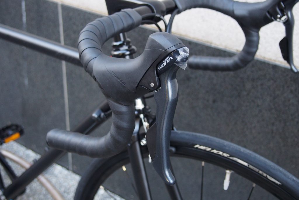 コンポはSHIMANO R3000系SORA 2x9SPEEDを採用しております。STIレバーはレバーから手を離さずとも変速できます。また変速ワイヤーもドロップバーに沿う形となりますのでハンドル回りもスッキリとした印象。