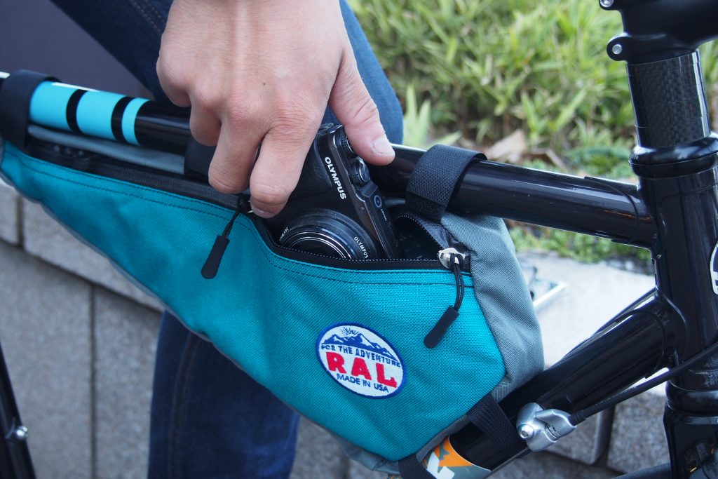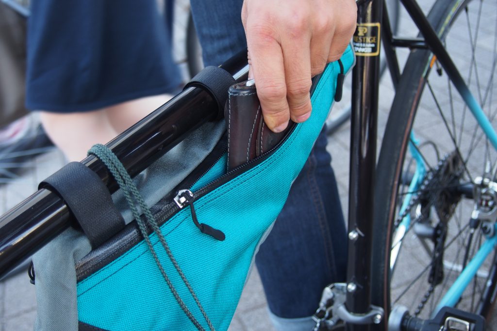 フレームバッグは自転車の中央に位置する為、荷物の重量が車体への加重バランスを崩しにくく、また乗車中でも中の荷物へアクセスしやすくとっても便利。