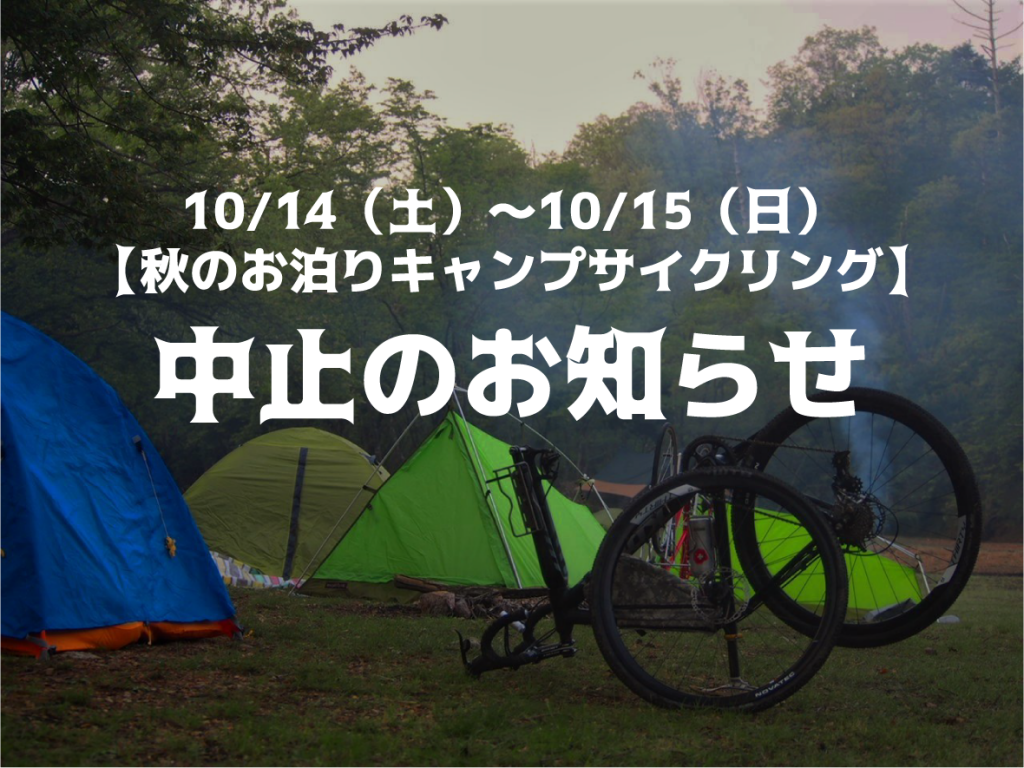 10/14(土)~10/15(日)に予定しておりました【秋のお泊りキャンプサイクリング】は、当日悪天候が予測されますので、一旦中止とさせて頂きます。