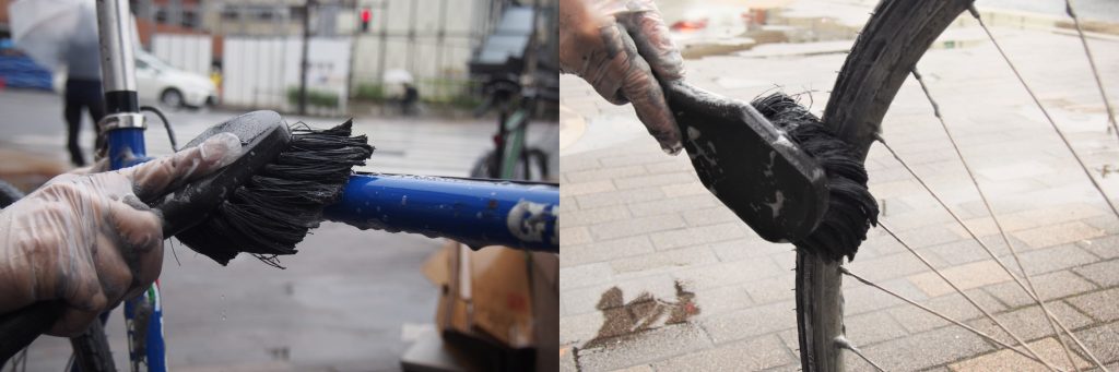 まずは、自転車全体の汚れを中性洗剤等を使用して、洗浄していきます。埃や泥の付着が落とされこの工程をすることにより、今後の作業がグッと効率よくはかどります。
