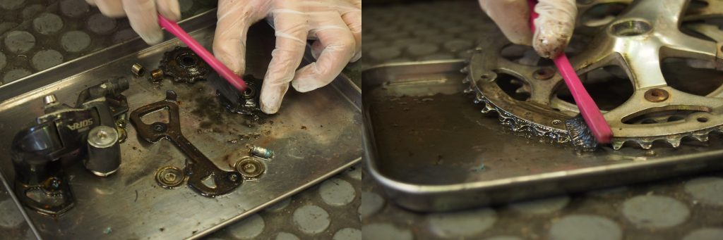 続いては各パーツの洗浄。ディレーラーも可能な限り分解して洗浄していきます。