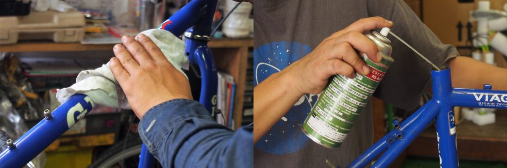 組み立ての前に、「RESPO防錆スプレー」と、「WAKO’Sバリアスコート」で、フレームをクリーニング&表面処理していきます。