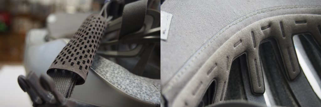 高機能性ながらも、ウルトラスエードを使用した内装やチンパッド、布製バイザー等、ファッション性を高めるべく、”素材”感への拘りも見て取れます。