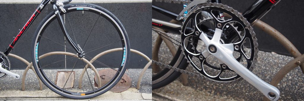 2000年代前半という事もあってパーツの構成は少々古め。9速時代の5500系105をメインにクランクのみSUGINO、ホイールは今では見る機会も少なくなったWH-R540という懐かしい感じになっています。