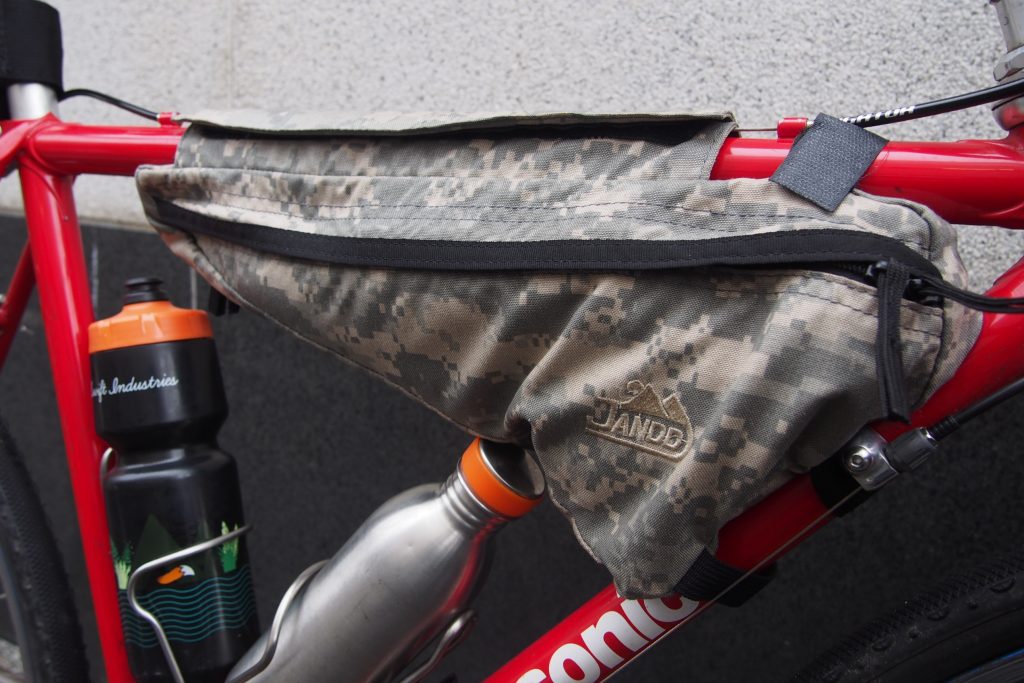 前回のバイクパッキングでも登場したJANDDのフレームバッグ。もはや説明不要といったところですが、やはり便利なものは便利という事で今回もスマホや財布・ヘッドライト等のすぐに取り出したいものを入れて使いやすく。