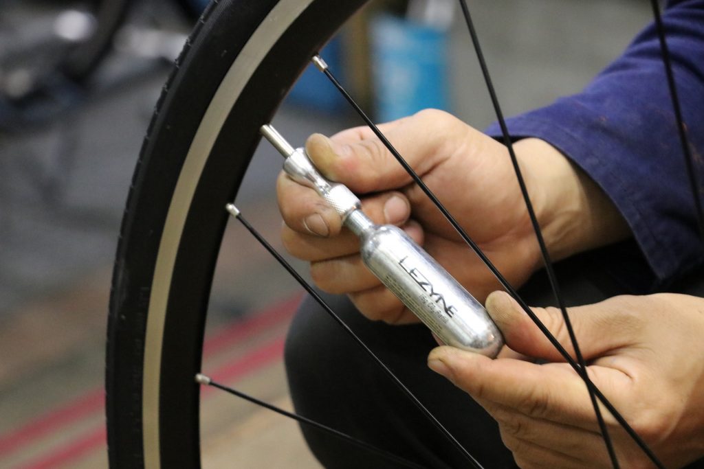 空気入れの際はツールからCO2インフレーターを取り外し、通常通りボンベ-インフレーター-バルブの順で繋げばOK。(CO2ボンベを使用する際はボンベの急激な冷えにより火傷の危険性がありますので手袋やカバー等をお使いください。)