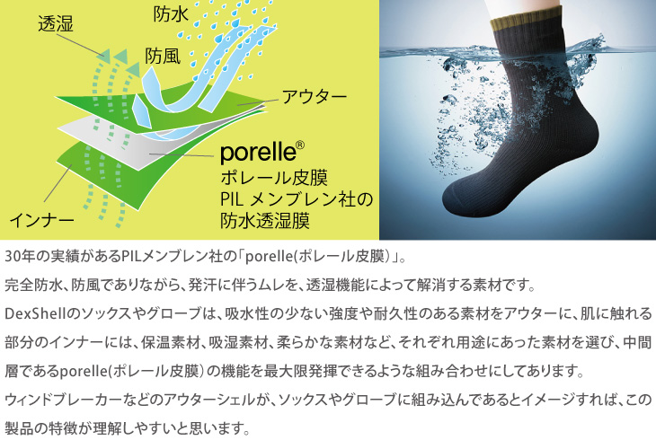 「完全防水」「防風」+汗による蒸れを外に排出する「透湿」機能を併せ持つDEXSHELLのソックス