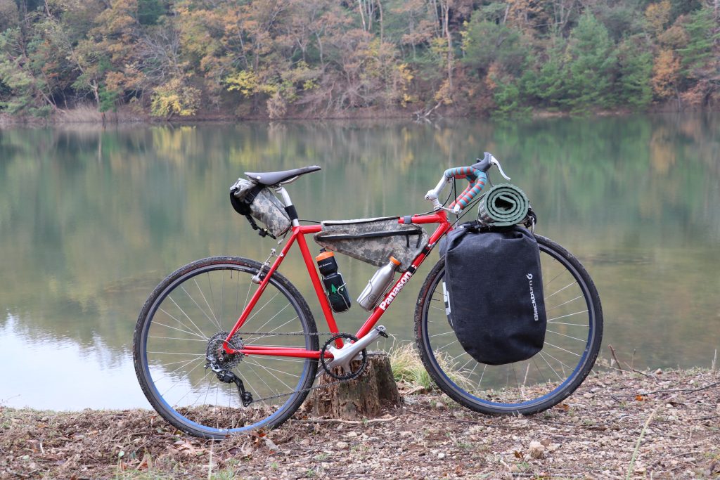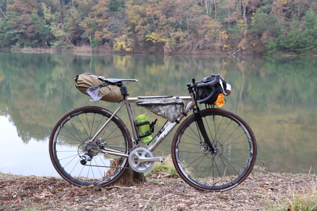 キャリア無しのバイクパッキングスタイル。軽く仕上がるので走りは軽快。