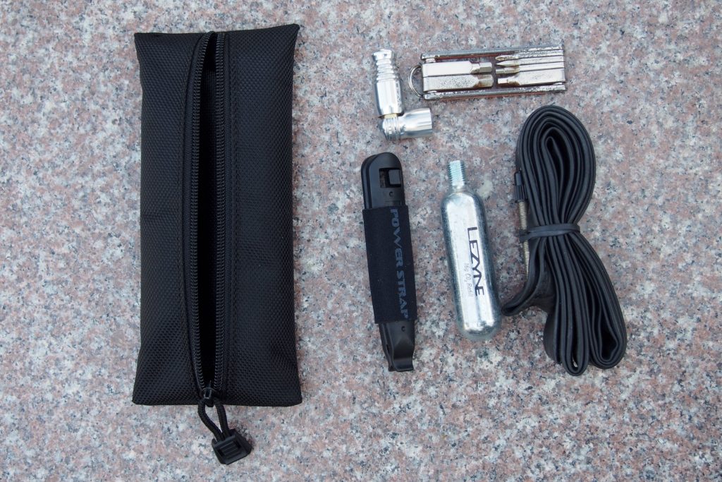 付属のツールポーチにはロードバイク・シクロクロス・グラベルロード等の必要装備【予備チューブ・タイヤレバー・CO2インフレーター・CO2ボンベ・マルチツール】がピッタリと入るサイズ感になっており、ワンデイサイクリングがメインの方にはちょうど良い装備の量になります。