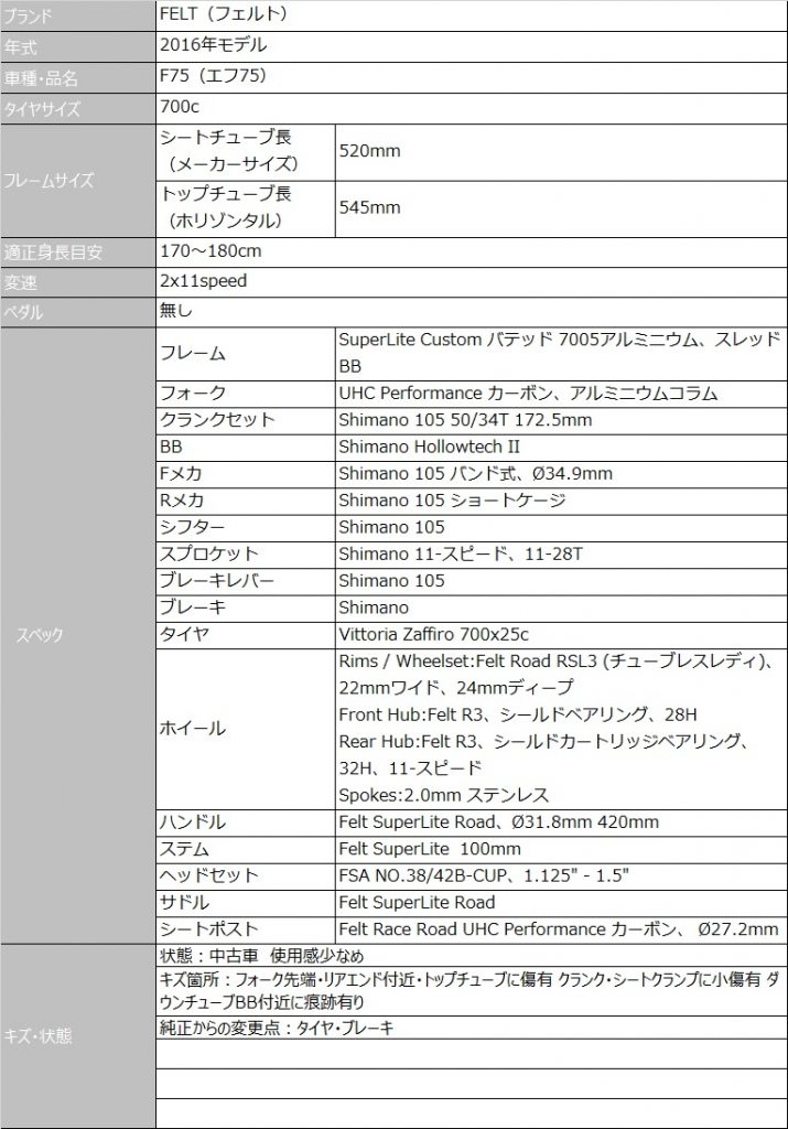 ”中古ロードバイク”【 FELT / フェルト 】F75 2016モデル