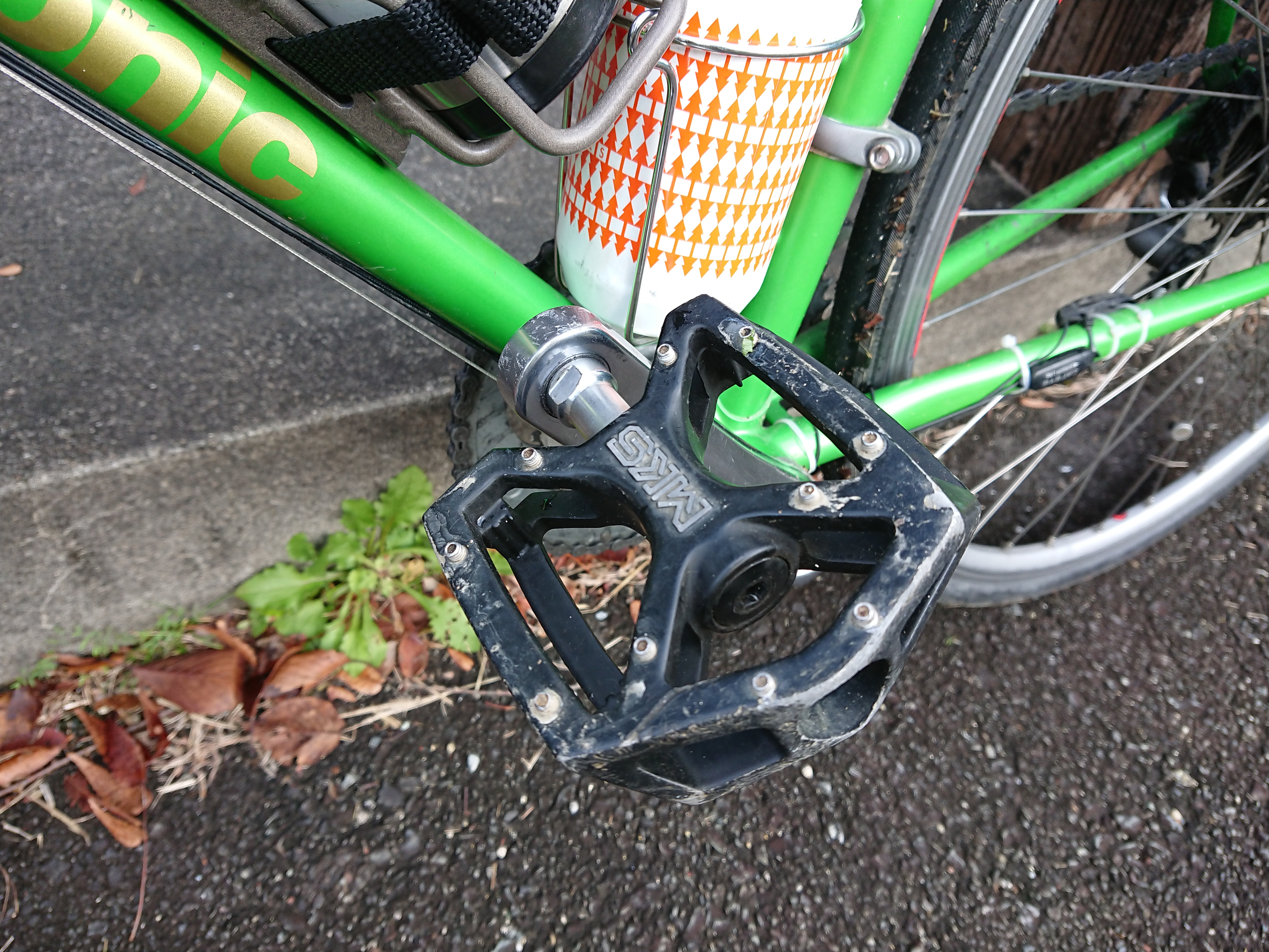 荷物を積んでのビンディングシューズは怖い!!という事でフラットペダルに交換。