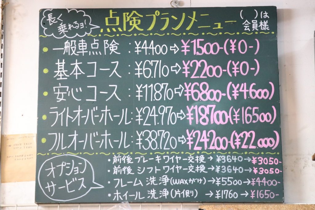 こんな感じで当店では自転車の使用年数や状態に合わせた点検プランをご用意しています。もちろん、グリスアップやドライブ周りの洗浄など必要な部分だけ追加したりというのもOK!是非ご相談下さい~