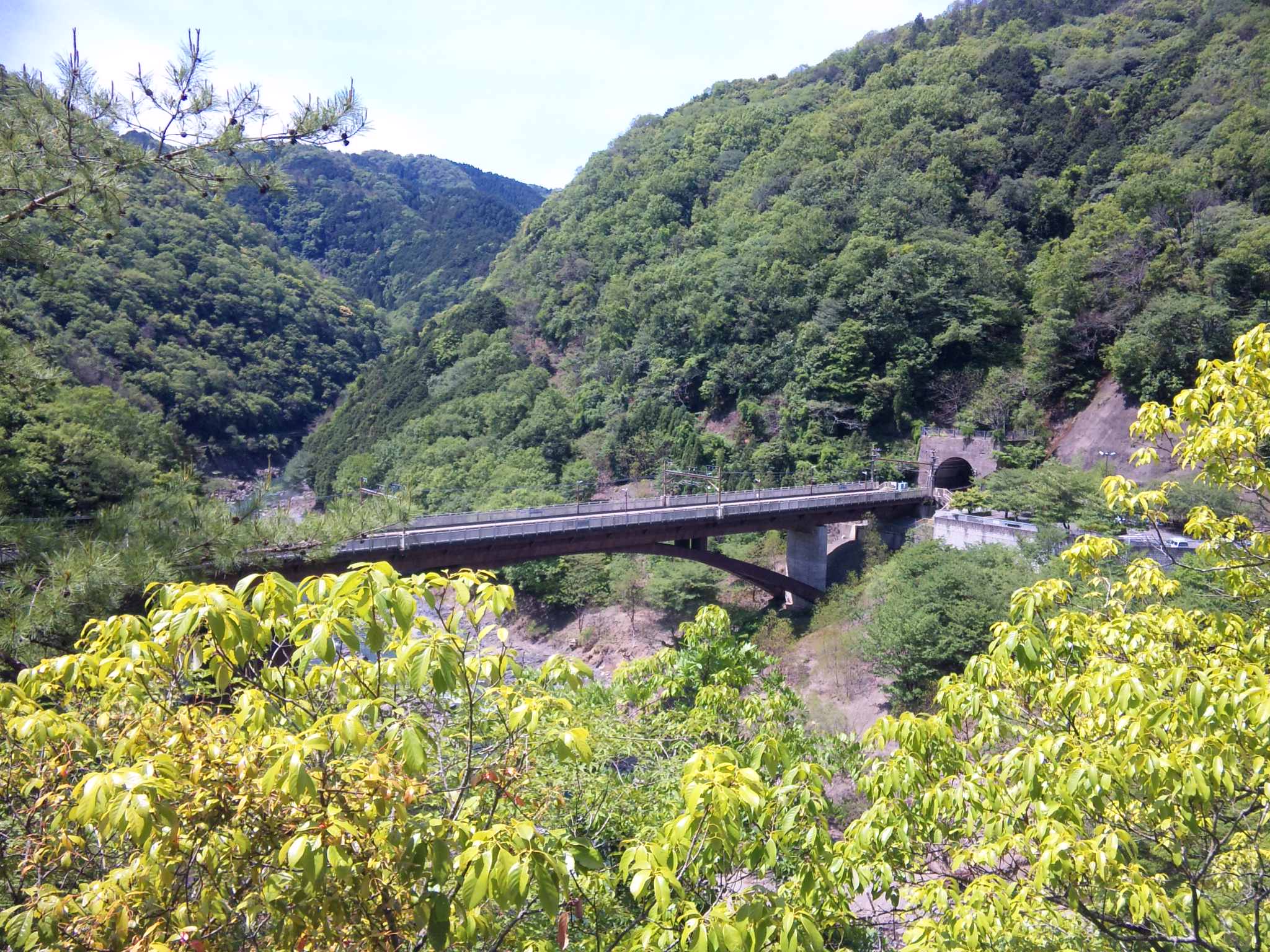 渓谷にかかる橋の上にある保津峡駅が一望できる絶景サイクリングコース