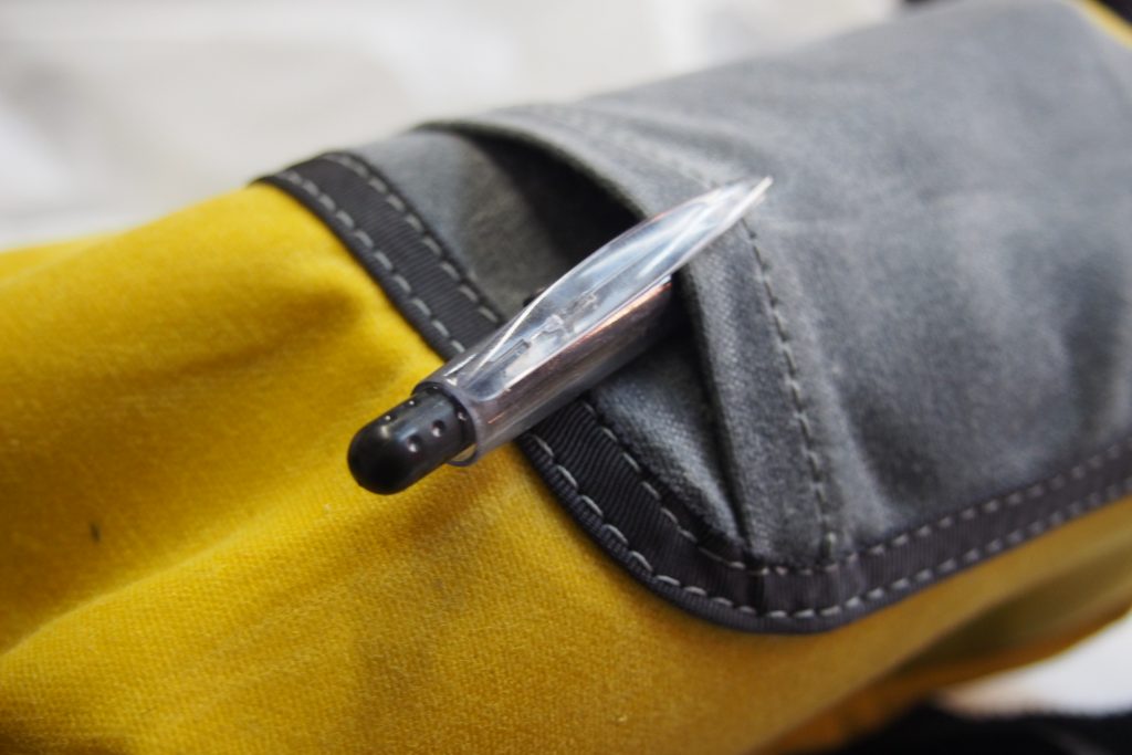 横面についているこちらのタブ、後程詳しくご説明させていただきますがここにポケットが追加に。外部の超薄型ポケットという事であまり荷物は入りませんがペンを差したり・パンク修理のパッチを忍ばせて置いたりと結構便利に使っていただけそうです。