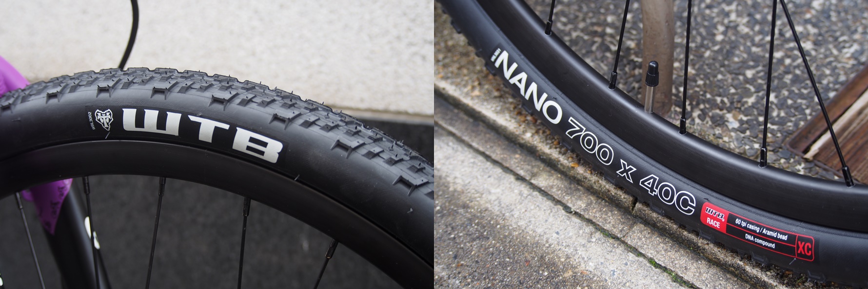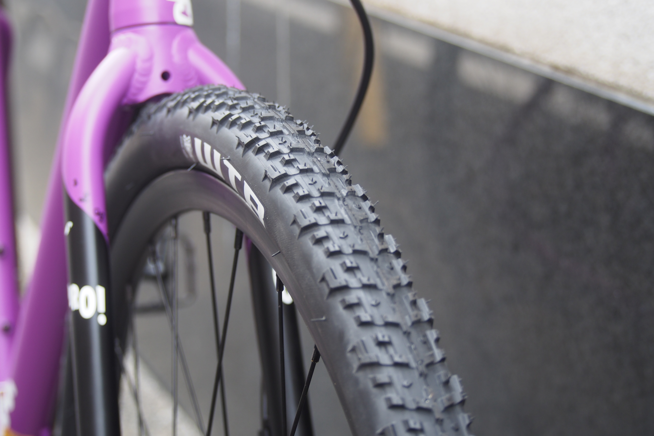 低めのノブにワイドでエアボリュームある40cというサイズ感はトレイルも楽しく走れるオフロードバイクの様相。