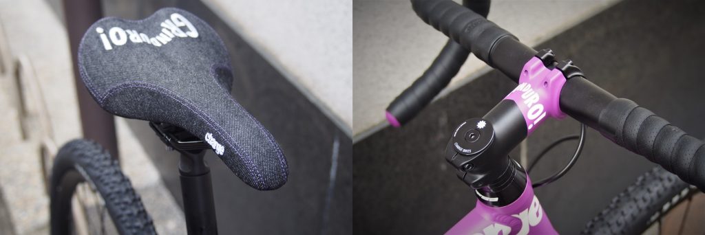 GRINDUROのテーマカラーであるパープルのステッチが入ったデニムサドル。
