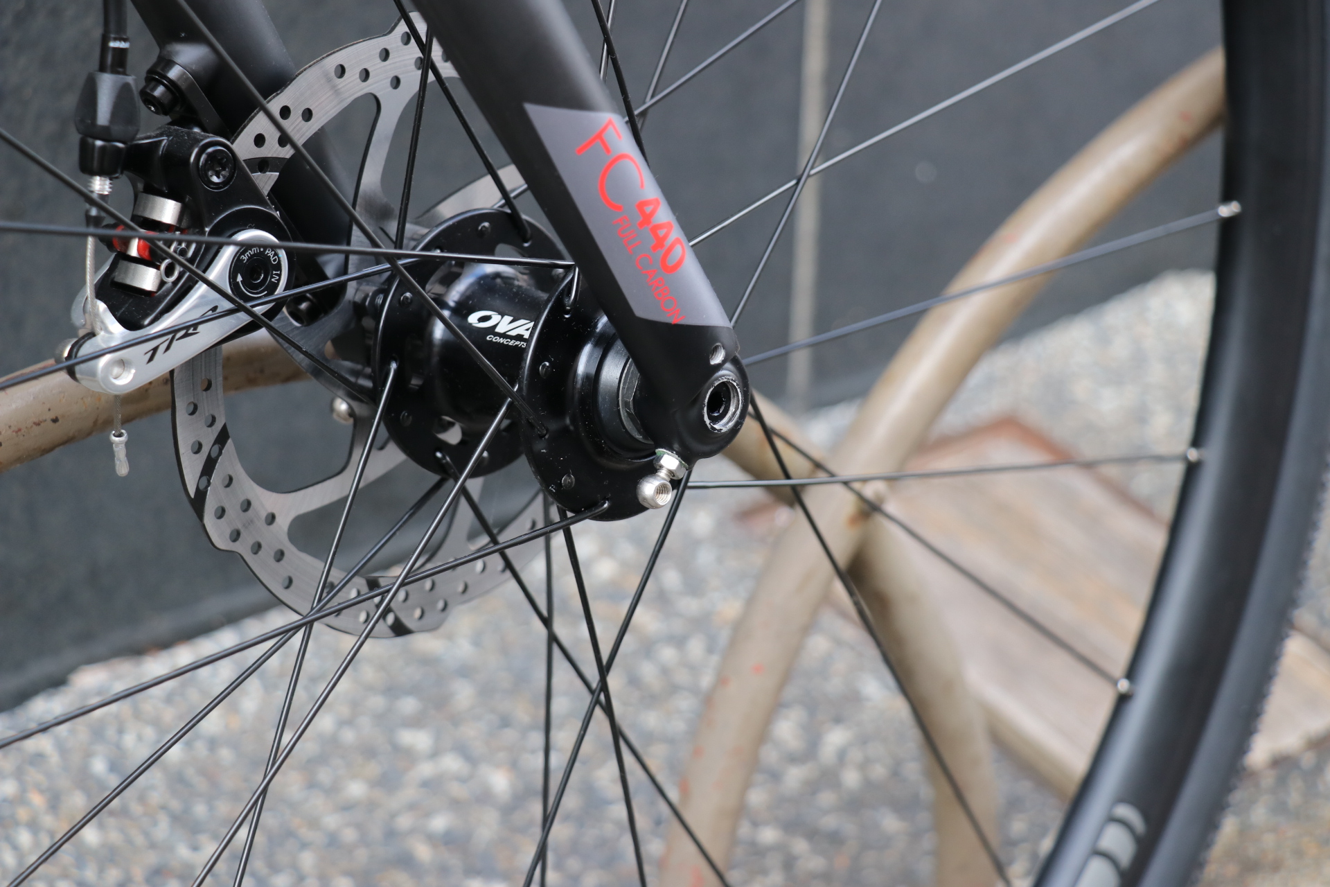 軽量フレームに合わせるのはフルカーボンフォーク。ボトルケージアイレット付き&12mmスルーアクスルとトレンドを抑えた内容です。