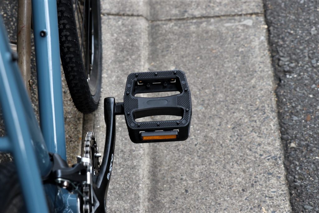MTBに似合いそうな大型のプラペダルが標準装備されています。