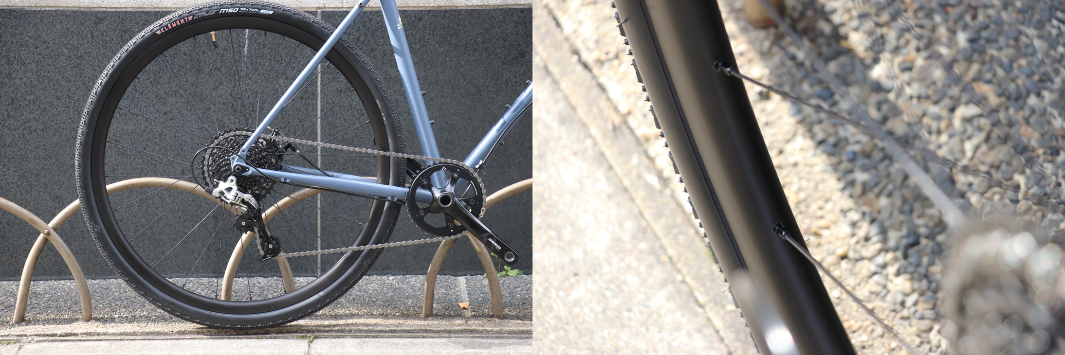 標準タイヤ700x36Cながら最大タイヤ42cまでOKなクリアランスを確保。リアキャリアダボ・前後フェンダーダボ・フレーム内ボトル台座x2に加え、ダウンチューブ裏、フォークサイド左右にもユーティリティボルト台座が用意され、普段使いには勿論、テントなどを積載したキャンプツーリングなどにもスムーズにアプローチ出来るマルチパーパスな一台としてデビュー当時から現在にまで非常に高い評価を得ております。
