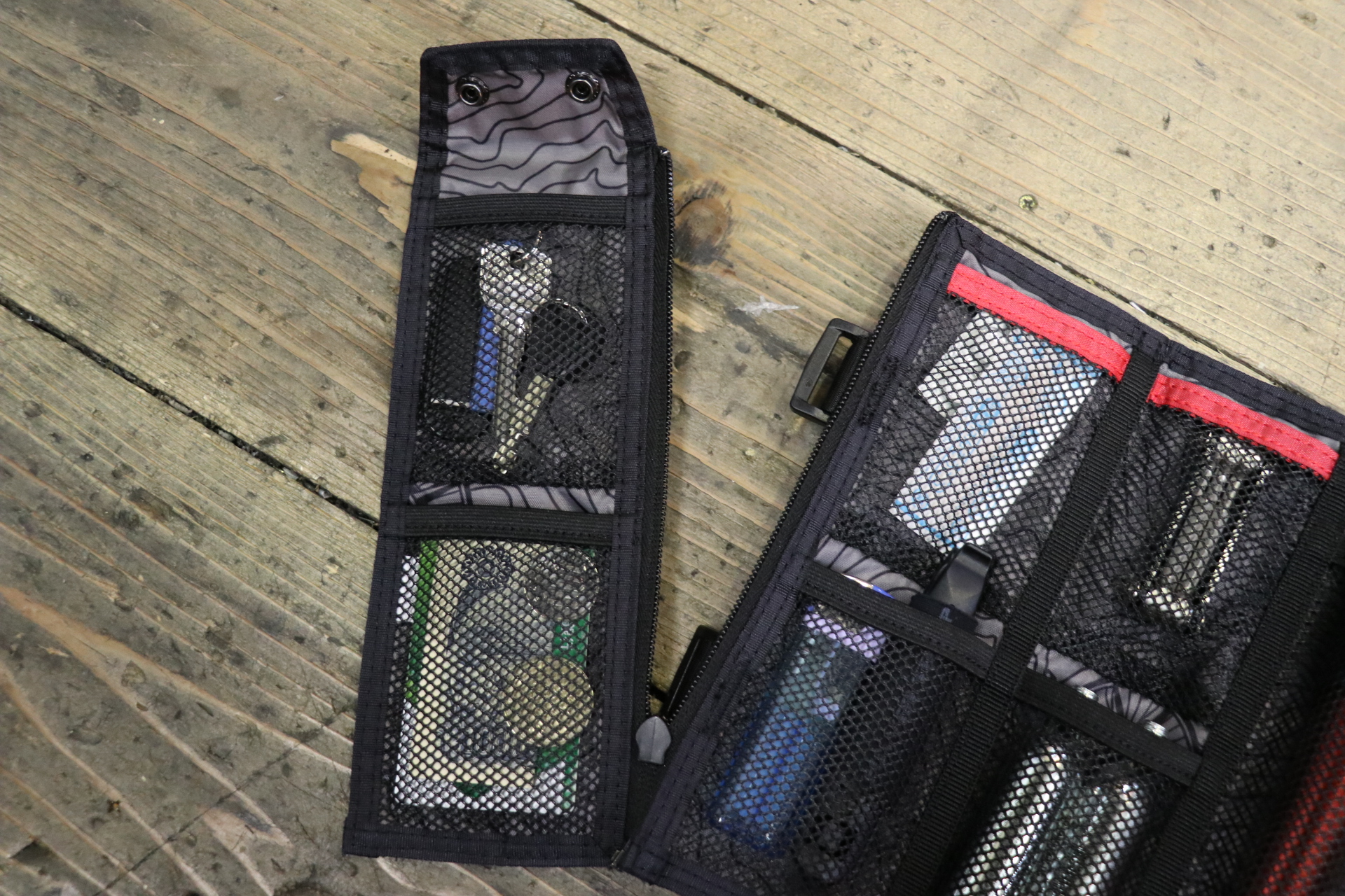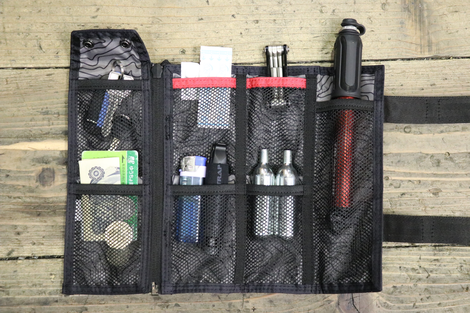 ロールの中身はこんな感じ。CO2ボンベが2本入るサイズのポケットが6つとポンプなどの長物にちょうど良い縦長ポケットが一つとかなりボリューミー。いわゆるロールタイプのサドルバッグがパンク修理と簡単な調整用のツールだけでギッシリなところをコレなら絆創膏やライターなどなど、他の物も持って行けちゃいます。