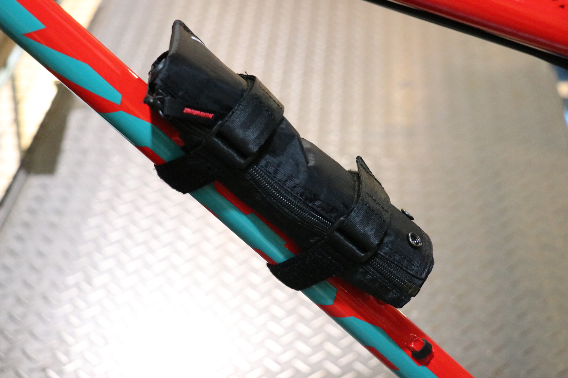 ぺらっと平たい形状からどうしてもフレームのまっすぐなところに固定するイメージになりますが、縦長ポケットにポンプでは無く、チューブなどの柔らかい物を入れておけばフレームの角やもちろん、サドル下にも取り付けOK。使い方次第で無限の可能性があります。