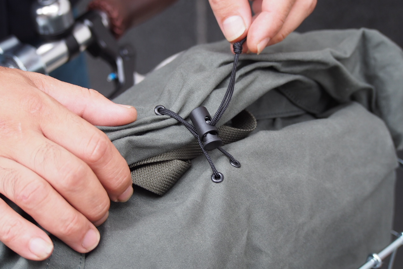 ちらりと配備されたドローコードでバッグの口をくりんと閉めておく事が可能。