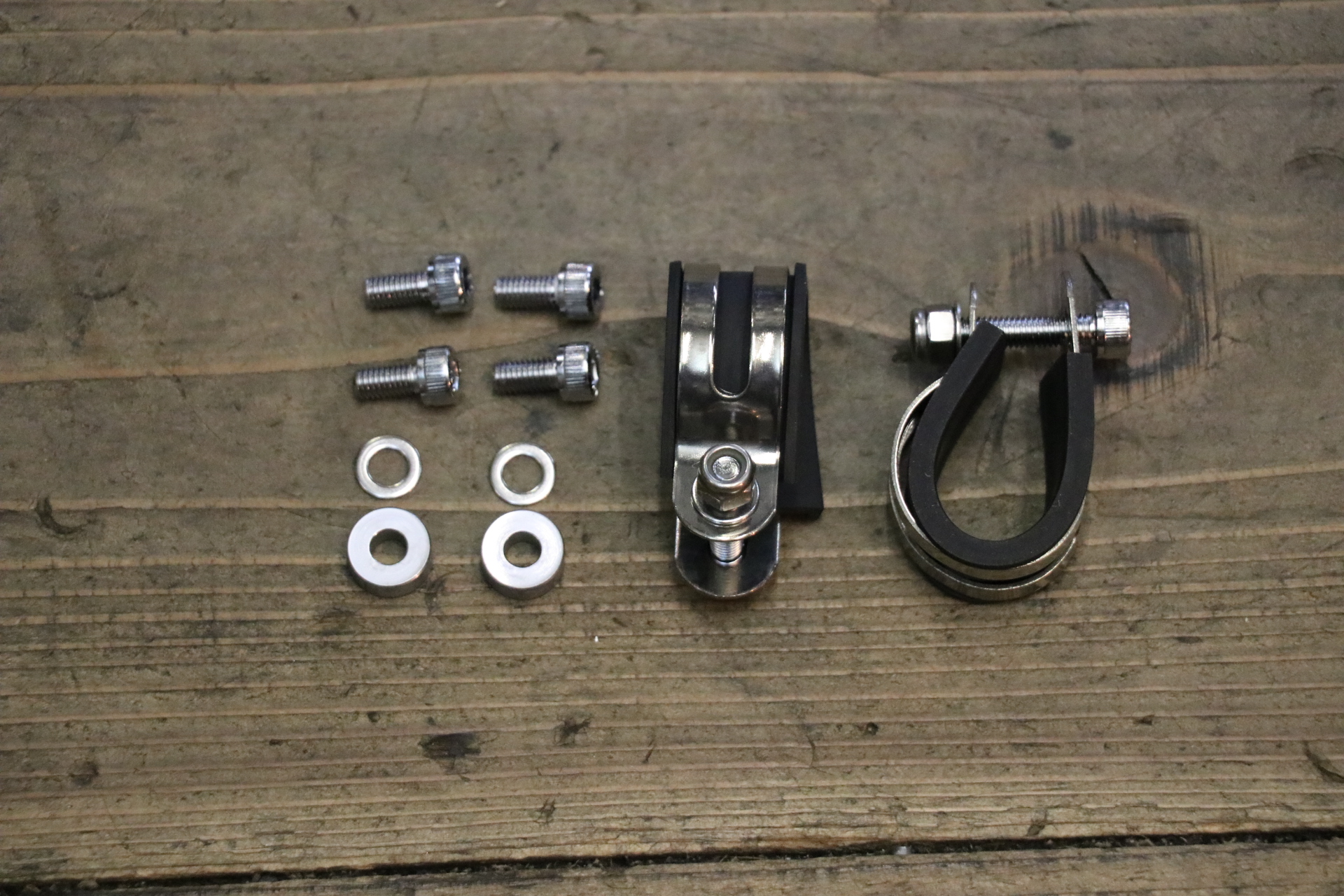もう一つはフォークレッグとの固定ですが、トラス構造を兼ねるレールに好きな方法で留めるタイプ。フォークダボがあれば直付けもよし、NITTOのバンドを使うもよしと自転車に合わせて選べる仕組み。実はこの取り付けにするとキャリアのメインフレームとフォークがすごく近くなるのでクロモリ特有のしなりを抑えてくれる効果もあります。