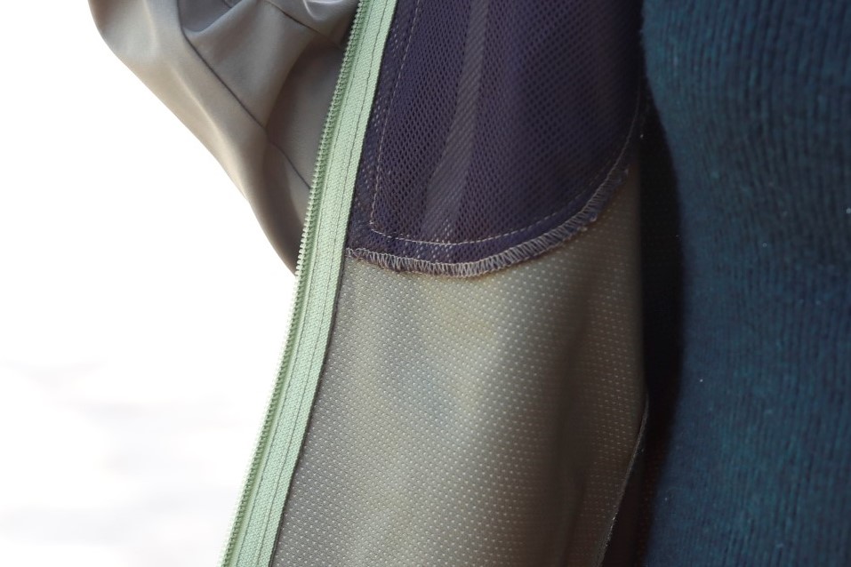 そんなときは両脇のベンチレーションファスナーを開放すれば外気を取り込む事が出来、衣類内の体温調整にひと役買ってくれます。
