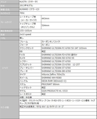 ”中古ロードバイク ”【 KUOTA / クオータ 】KURARO 2013モデル