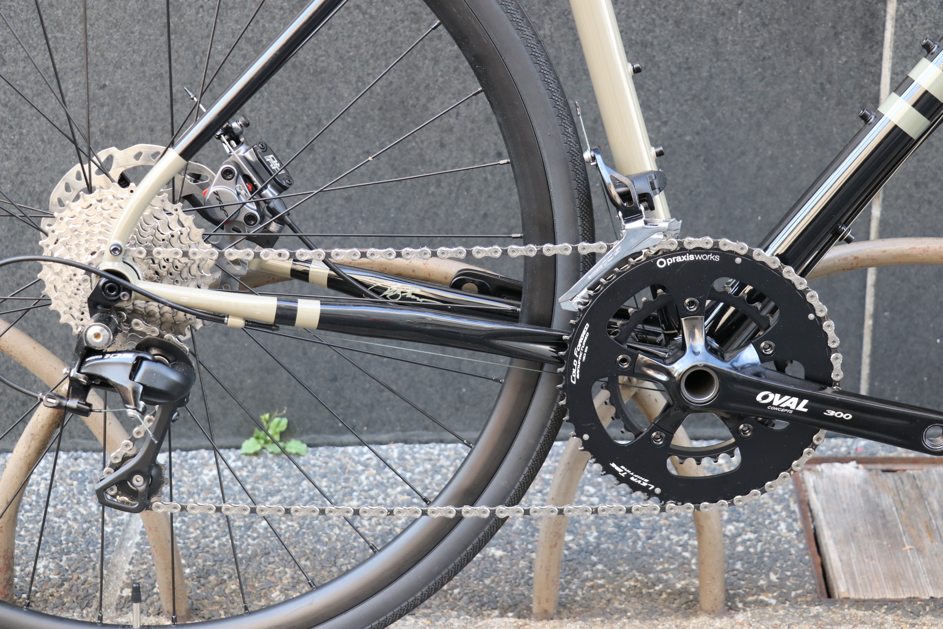 クランクにはOVAL製アームに剛性高いPRAXISWORKSのチェーンリングを合わせたもの。この仕様でも充分ですがより変速性能を高めたい方にはSHIMANO105クランクへのカスタムもオススメです。
