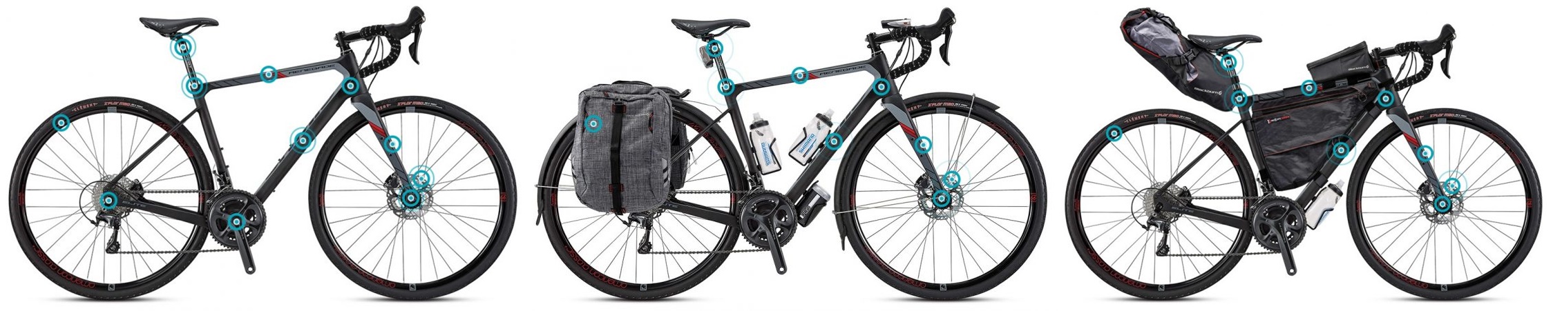 最大タイヤクリアランス40Cを確保し、低いBBドロップ、長めのチェーンステー、寝かしたシートステーと、荷物を積載してもふらつき難く長距離ライドに適した設計を持つフレーム(詳しくはこちら)をベースに、悪天候時でも安定した制動力(ストッピングパワー)をもつディスクブレーキを仕様し、全てのモデルに走り心地をよりしなやかに軽くする事を可能とするチューブレス対応リムを採用しております。
