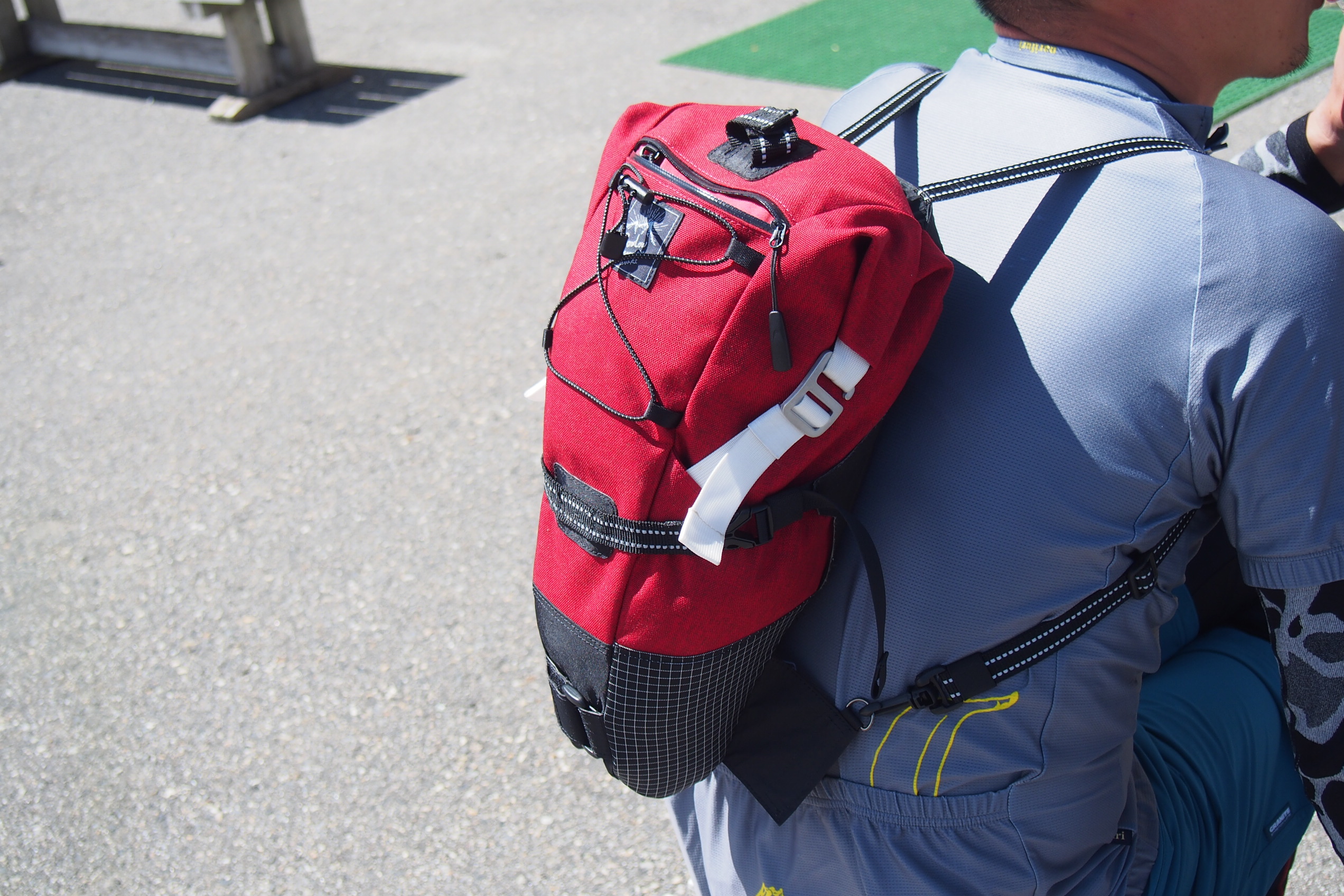 と、ここまででもバイクパッキングバッグとして必要十分な機能性ですが、”背負える”というのがこのバッグ最大の特徴です。