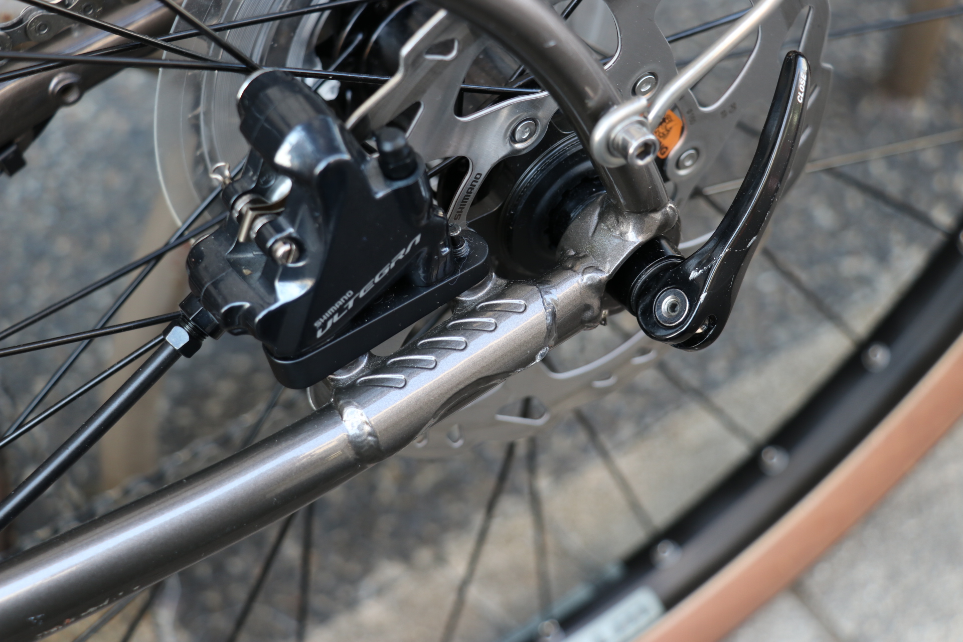 ブレーキキャリパーはフラットマウント。マウント部分の補強も雰囲気がある仕上がりです。
