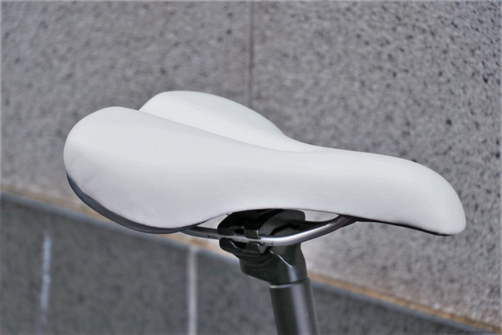 サドルはクッションのしっかりと詰まった柔らかいサドル。スポーツバイクに乗った事の無い人にお尻が痛くなりそうなイメージを持っている方も多いかと思いますがこのサドルなら安心です!!