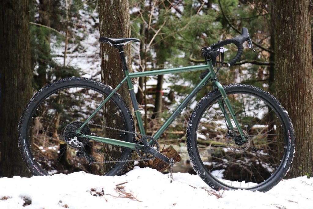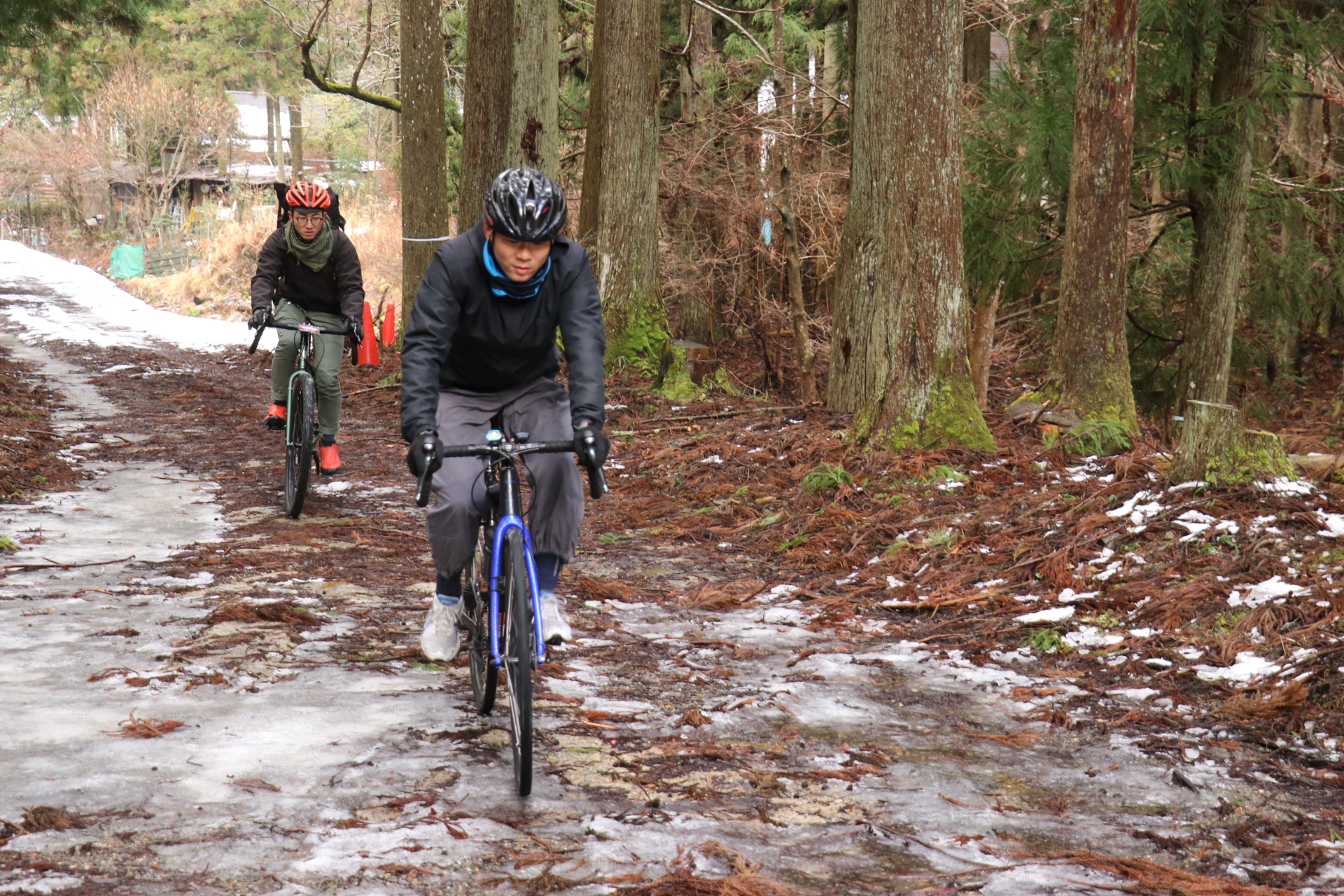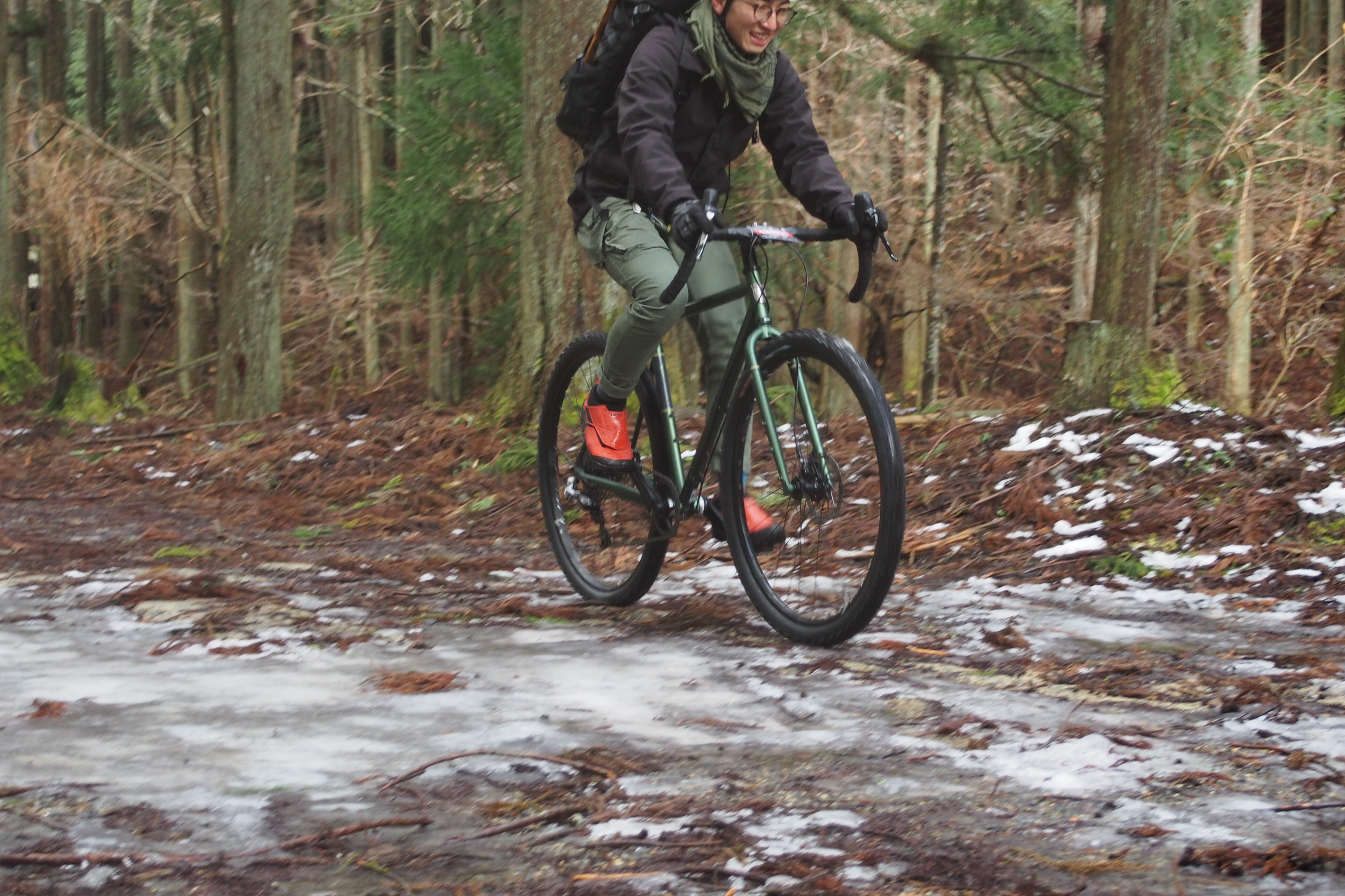 アプローチのオンロードもドロップハンドルで軽快に進め、薄氷の上やトレイル程険しくないダートは700×50cで充分にグリップしてくれていました。