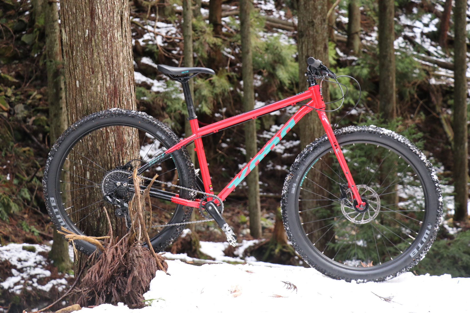 クロモリフルリジットのシンプルなフレームに27.5×2.8のセミファットタイヤの組み合わせ。