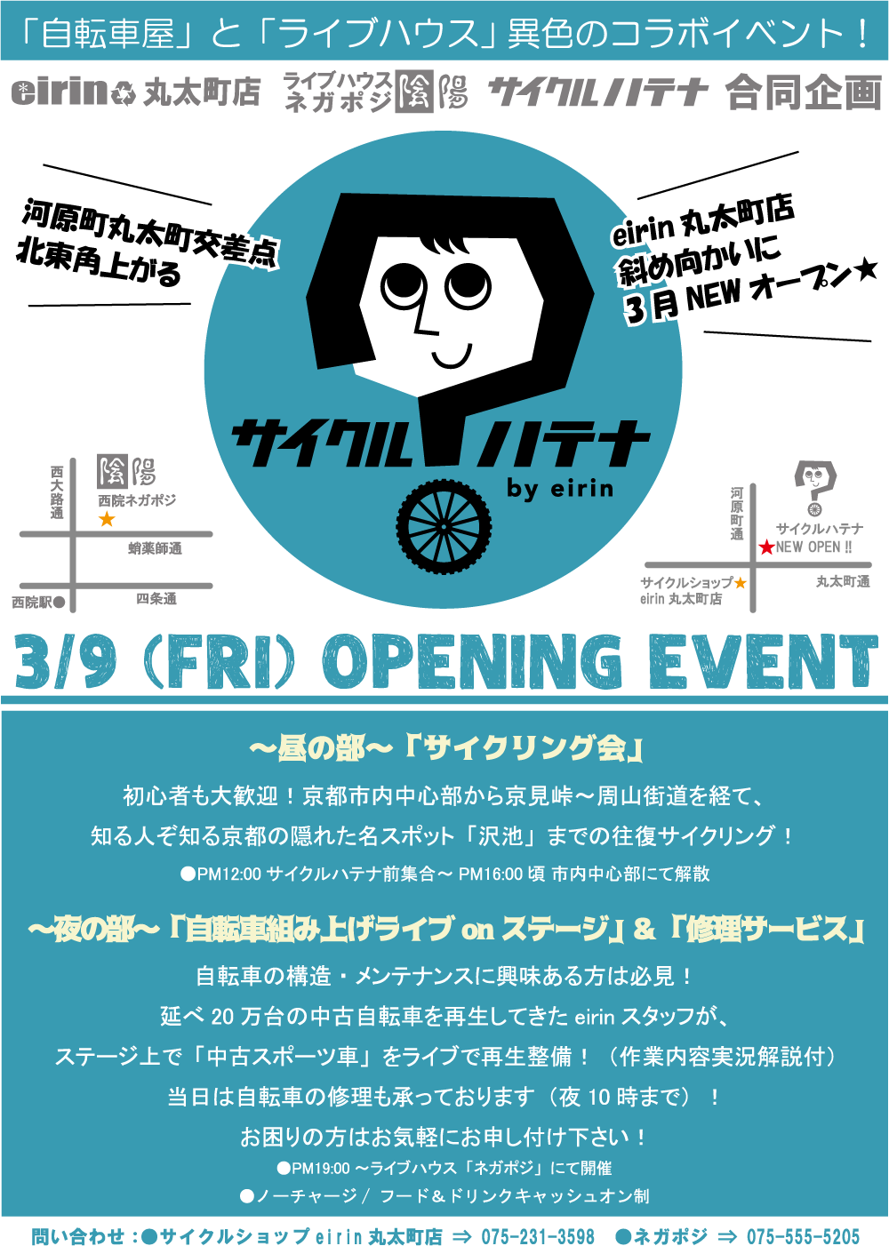 公私共にお世話になっております西院のライブハウス「ネガポジ」さんと、当店「eirin丸太町店」で、「サイクルハテナ」の新規オープンに伴う形で合同企画したイベントとなります。