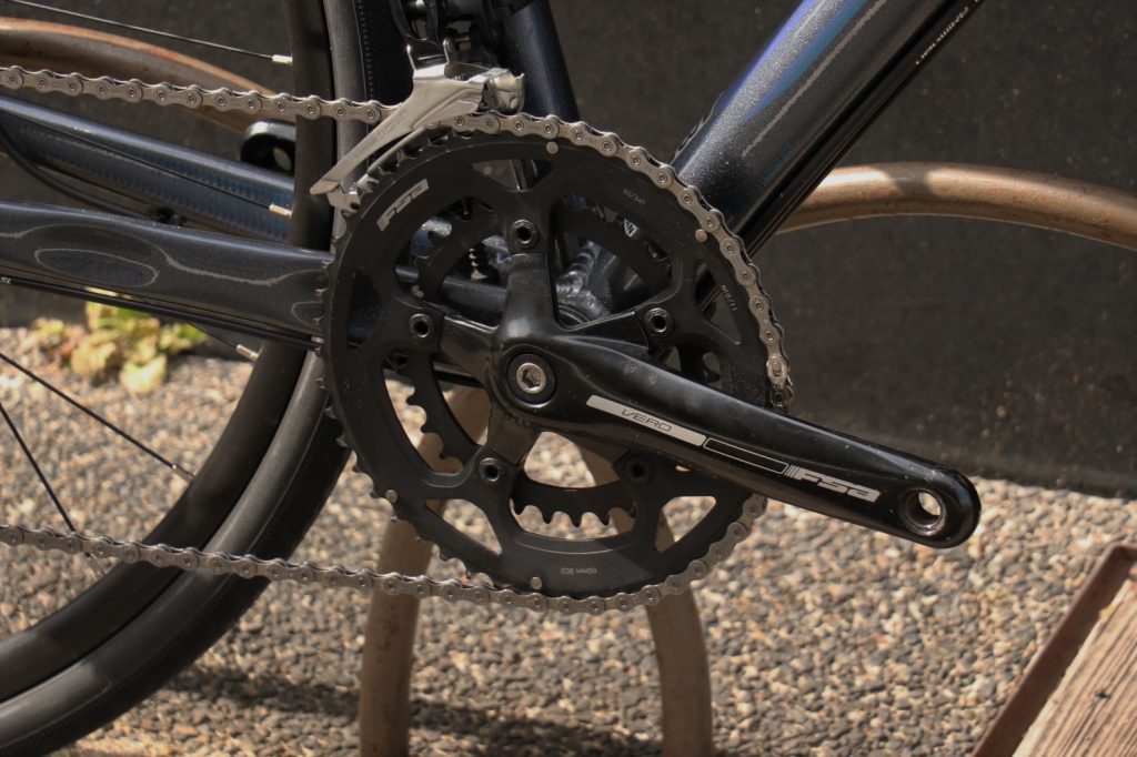 クランクはFSA VELO チェーンリングは50/34と標準的なロードバイクの歯数。