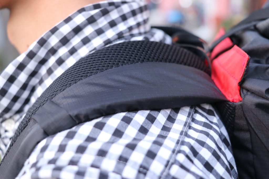 メッシュ処理されたショルダーベルト&背面は運動時におこる蒸れを除去してくれ快適に。