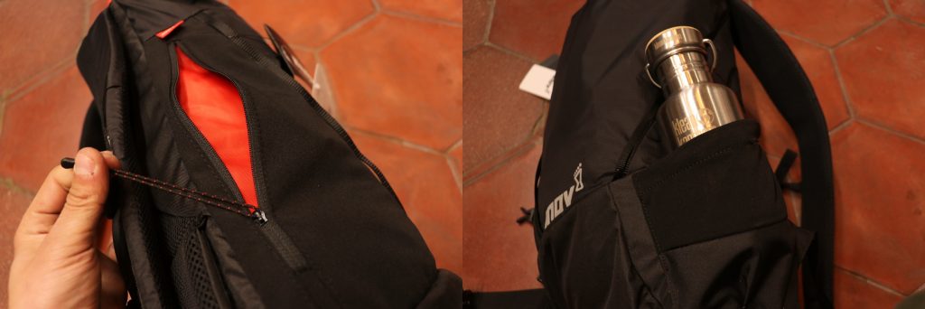 バック右側には、ボトルを保持するのにも便利なドローコード付きストレッチ素材のポケット、左側にはファスナーつきポケットが用意。