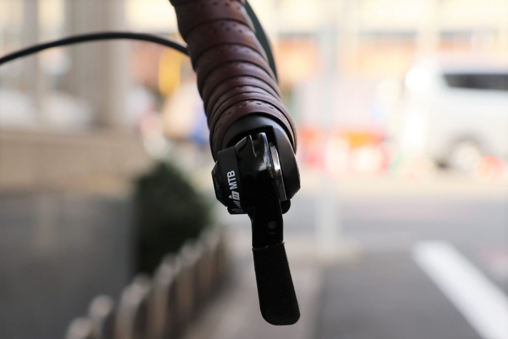 アルテグラクランクをベースに、◎WOLF TOOTH(ウルフトゥース)の4アーム用CXチェーンリング(¥11741税別)に、シマノMTBコンポ◎XTディレーラー ◎11-42Tチェーンリングをセット、そしてそれをINDEX(カチカチと止まるあれ)でシフティングするのは、現段階でシマノ11速用MTBディレーラーに対応するバーエンドシフターはこのシフターのみ、◎MICROSHIFT製 BS-M11 MTB 11speed Bar-end shifter(右側単体:¥8800-税別)というアッセンブルでクリア。