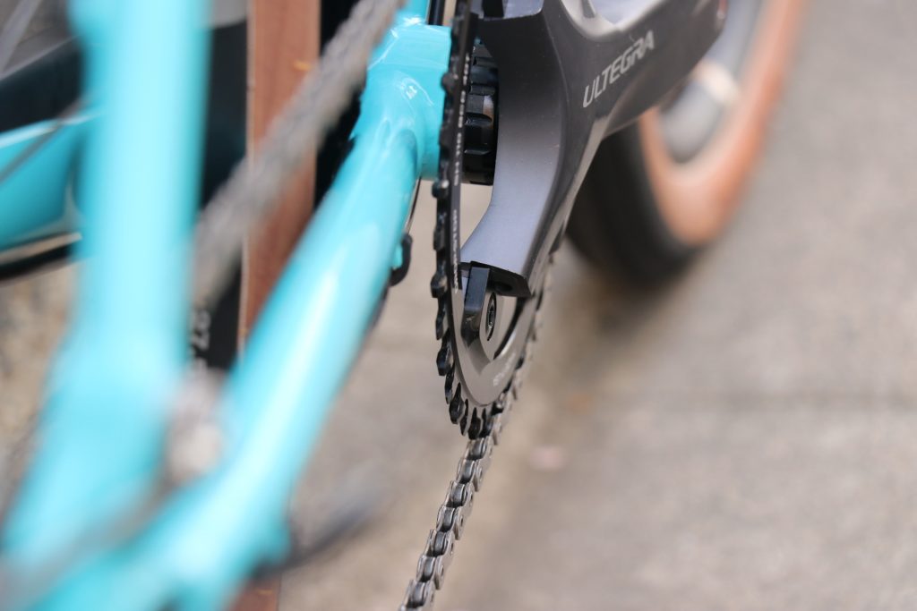 SRAMではいち早くラインナップされ、シクロクロスカテゴリー、最近では実際のプロロードレースでもお披露目された事でも注目度高い、ロードコンポにおける”フロントシングルシステム”。SHIMANOでは街乗り用コンポの「メトレア」にしかありませんが、今回はSHIMANOベースでの組み付け。