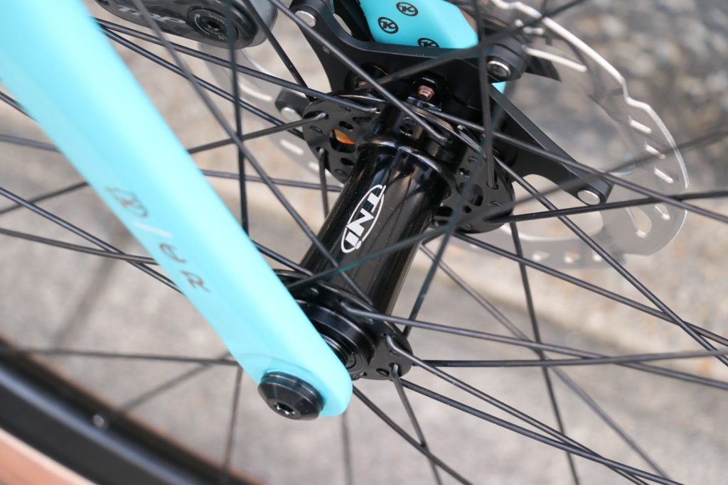 ホイールには軽量&コスパ高いハブ、◎TNI エボリューションディスクⅡに、◎WTB製 KOM TCS( ケーオーエム TCS)リム、◎DTチャンピオン スポークで。