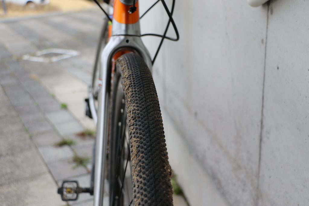 本フレームはメーカー公表値上では最大タイヤクリアランス42cという事で、チョイスしたのは市販されていないシュワルベのG-ONE 700x40C。