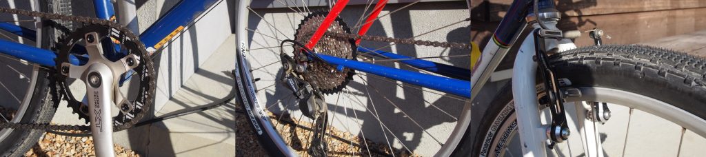 当時のものとして勿論26インチ仕様であります本モデル。今回は高速の巡航性+グラベル・林道へのアプローチを含め27.5インチへのサイズアップ、それに伴うブレーキキャリパーの交換、そしてナローワイドチェーンリング+最近デビューしたDEOREの11-42Tワイドスプロケットを採用したシンプルでトラブルの少ないフロントシングル変速仕様へのカスタムを施してあります。