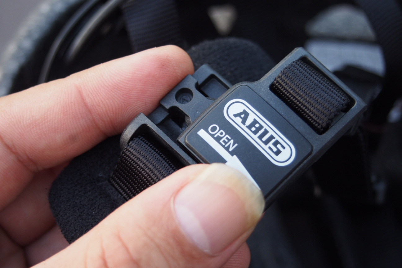 顎部のバックルはマグネットによるスライド式。通常のクリップタイプあるある、あごひげを挟んでイテテってなことにもなりません!