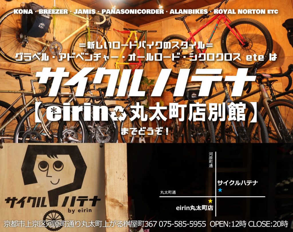 更に2018年3月からは既存店:eirin丸太町店のすぐ斜め向かいに“別館”として「サイクルハテナ」をNEWオープン!グラベルロードやツーリングバイク、それにまつわるアパレルやパーツ、バイクパッキングを始めとしたツーリング系アイテム、またキャンプグッズなど、今までの自転車屋の既成概念にとらわれることなくスタッフ自身が本音で良いと思えるアイテムをセレクト~販売もさせて頂いております。